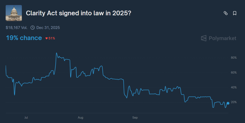 워싱턴의 논의가 본격화되면서 시장은 단기적으로 ‘규제 명확성’에 대한 기대를 반영하고 있다. 다만 예측시장 폴리마켓은 해당 법안이 2025년 말까지 통과될 확률을 17%로 낮게 보고 있으며, 디파이 범위·감독 권한·트럼프 행정부의 이해충돌 등 난제가 여전히 남아 있다.
