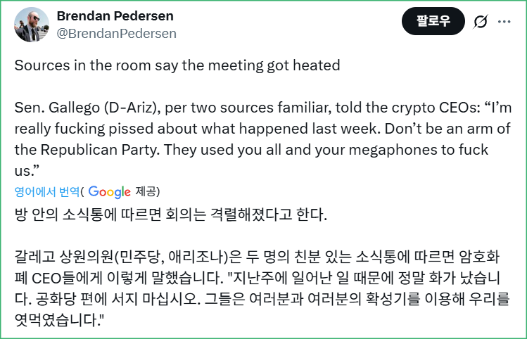 이번 주 미 상원에서는 민주당과 공화당 의원들이 각각 주요 암호화폐 기업 임원들과 비공개 회의를 열고 ‘암호화폐 시장 구조법(Crypto Market Structure Bill)’의 연내 통과를 논의했다. 회의에는 코인베이스의 브라이언 암스트롱, 리플의 스튜어트 알데로티, 체인링크의 세르게이 나자로프, 갤럭시의 마이크 노보그라츠 등 암호화폐 업계를 대표하는 인사들이 총출동했다.